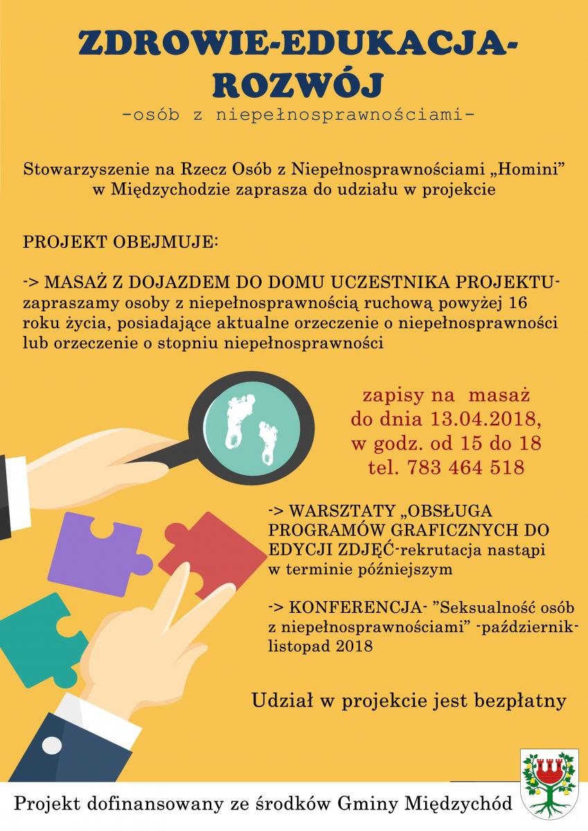 Stowarzyszenie na Rzecz Osób z Niepełnosprawnościami „Homini” w Międzychodzie zaprasza do udziału w projekcie Zdrowie-Edukacja-Rozwój osób z niepełnosprawnościami. Projekt dofinansowany jest ze środków Gminy Międzychód.