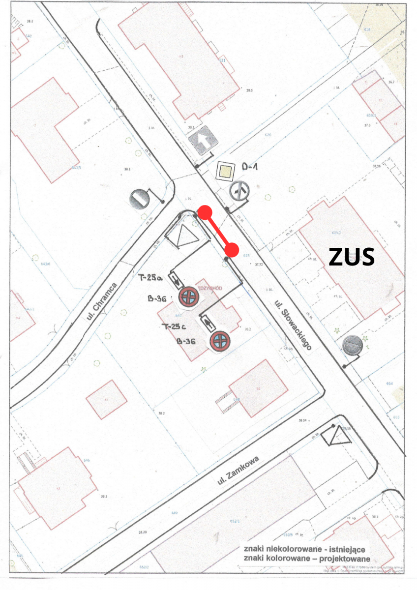 - ul. Słowackiego – zakaz postoju oraz zatrzymywania się na odcinku 20m przy prawej stronie wyjazdu z ul. Chramca