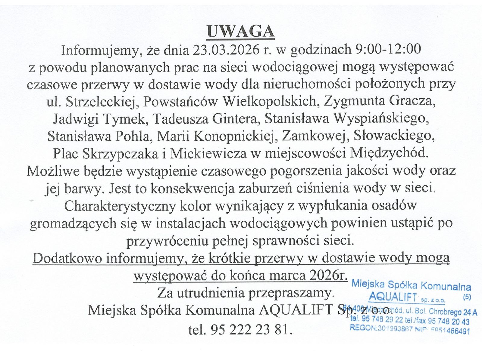 Jak informuje spółka Aqualift Sp.z o.o. w dniu 23 marca (poniedziałek) w godzinach 9 – 12 z powodu prac na sieci wodociągowej mogą wystąpić przerwy w dostawie wody do nieruchomości przy ul.: Strzeleckiej, Powstańców Wielkopolskich, Gracza, Tymek, Gintera, Wyspiańskiego, Pohla, Konopnickiej, Zamkowej, Słowackiego, pl. Skrzypczaka i Mickiewicza w Międzychodzie. Możliwe jest też czasowe pogorszenie jakości wody i jej barwy.